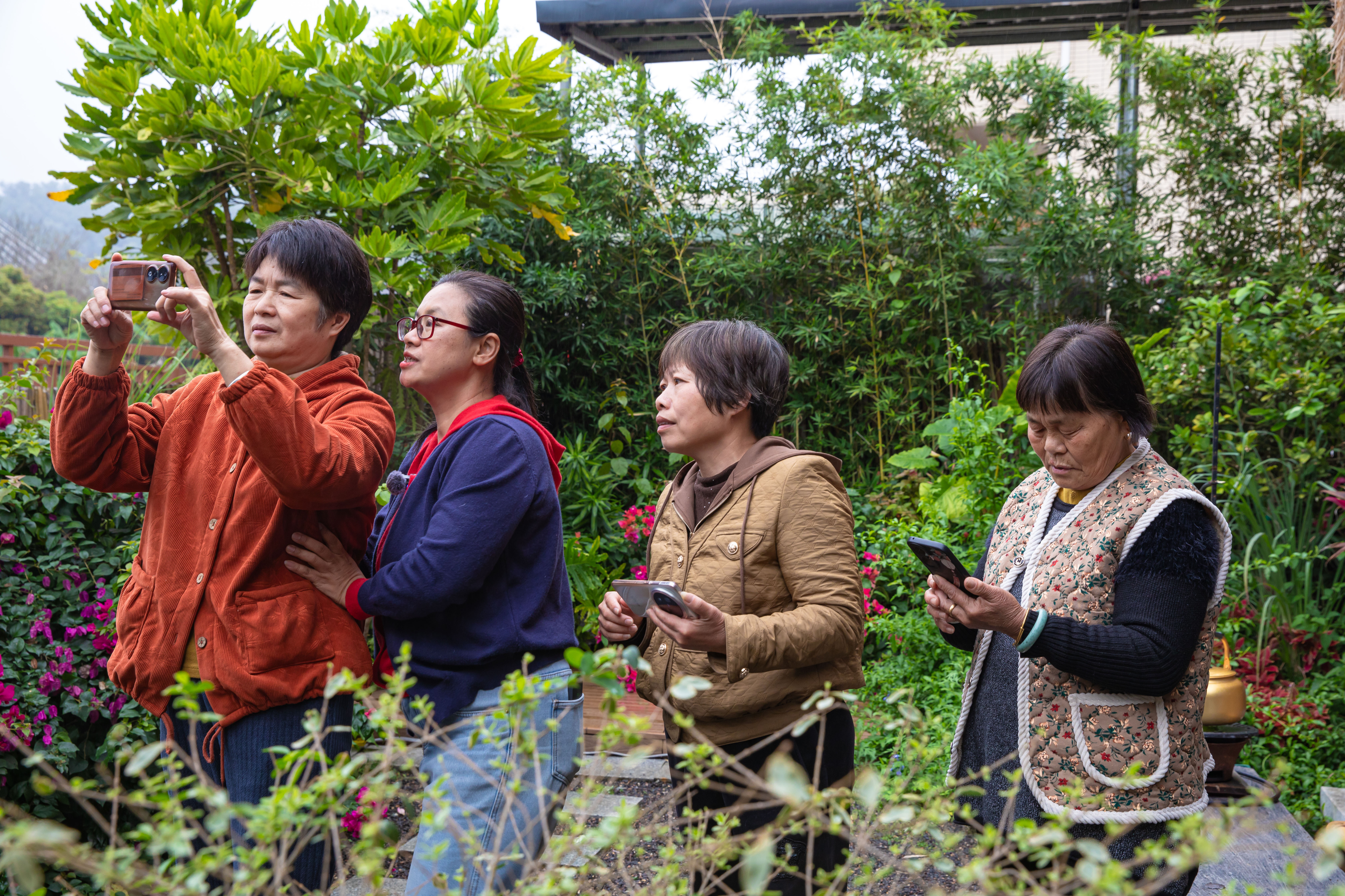 刘葵(左一)在户外教村嫂们运镜。