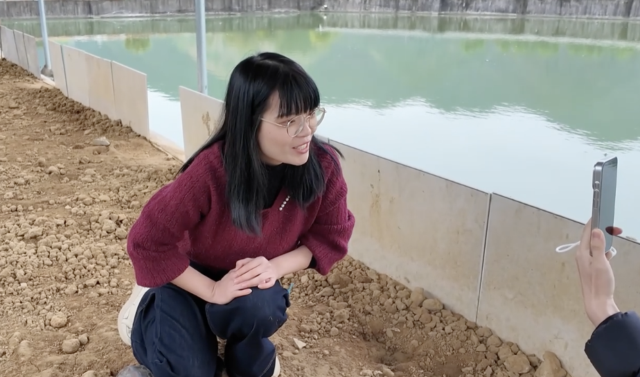 岑燕颖在龟塘旁拍摄短视频。
