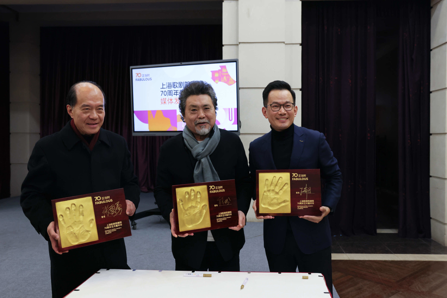 发布会现场,上海歌剧院的三任院长张国勇、魏松、石倚洁(左起)一起留下手印合影留念。